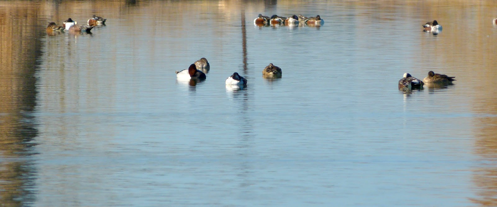 Northern Shoveler in the background with 2 Canvasbacks and 4 American Wigeon